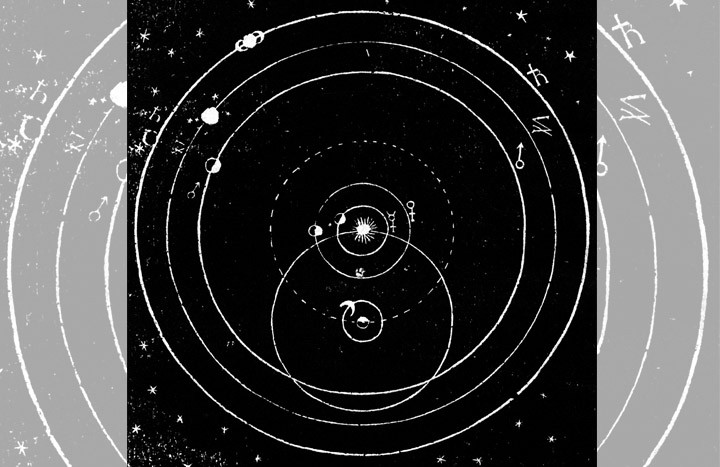 Die Abbildung zeigt eine Zeichnung des Weltsystems nach Tycho Brahe mit der Erde, um die sich die anderen Himmelskörper drehen. Durch eine gestrichelte Linie ist aber auch das Copernicanische System angedeutet, bei dem sich die Erde um die Sonne bewegt.